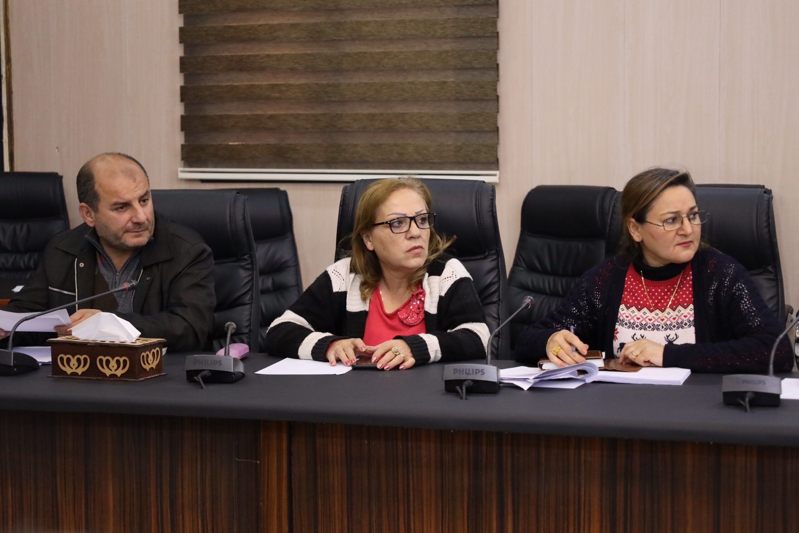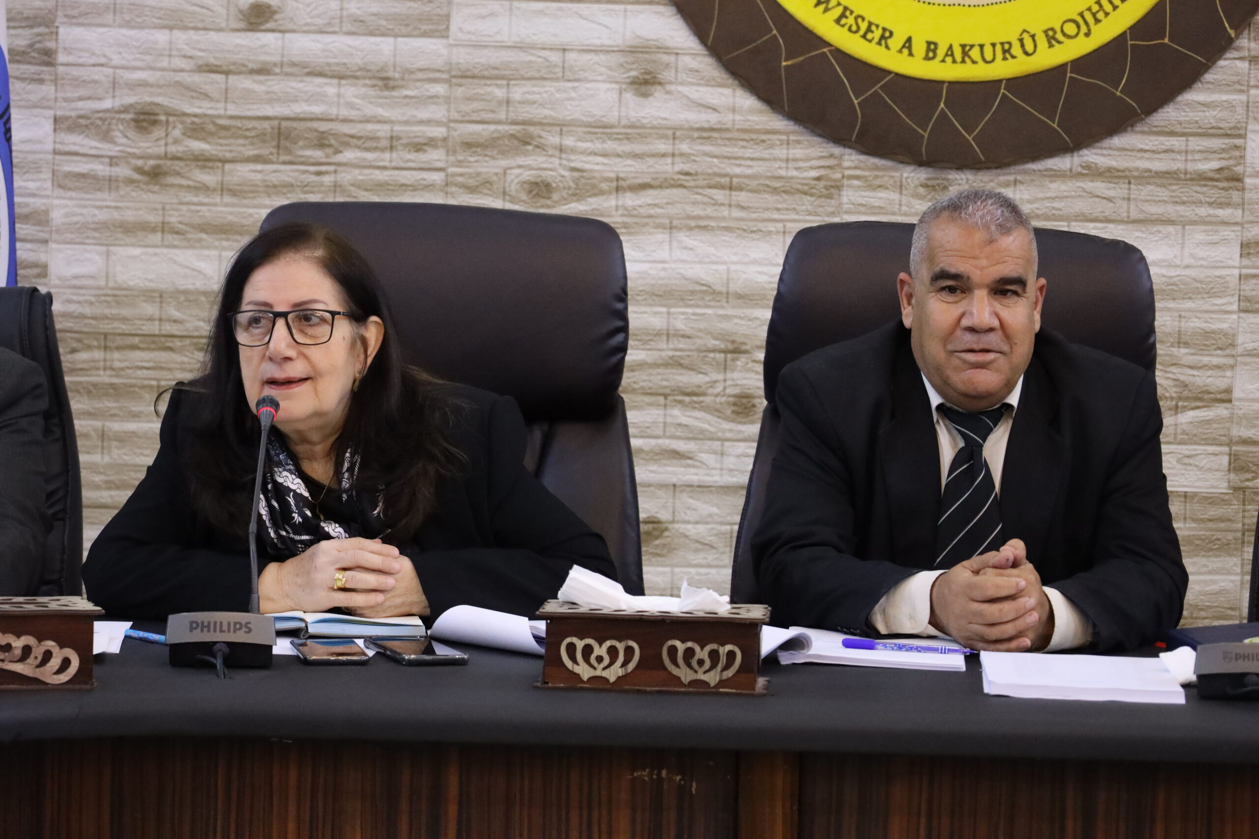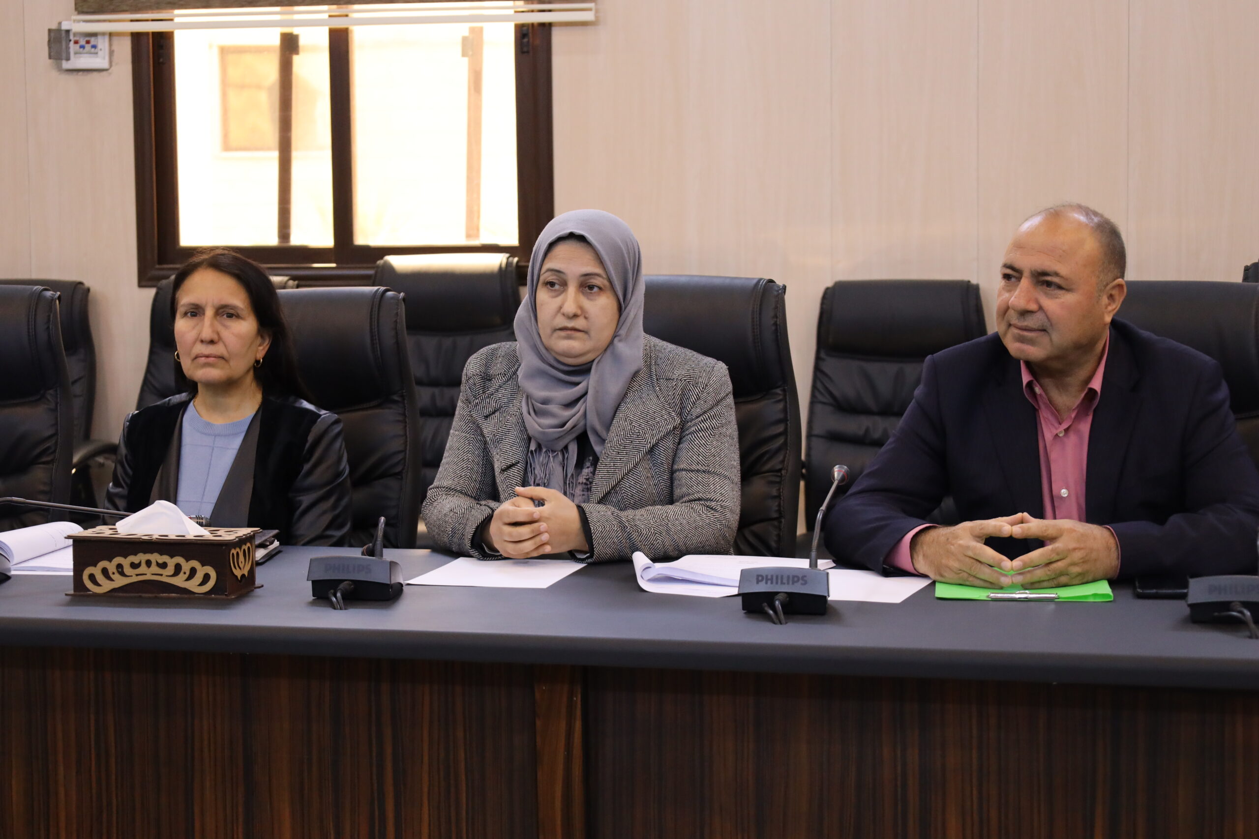 بحضور الرئاسة المشتركة للمجلس العام(سهام قريو وفريد عطي) وديوان المجلس وممثلين عن مجلس العدالة الإجتماعية في شمال وشرق سوريا لاستكمال مناقشة مسودة قانون العقوبات.