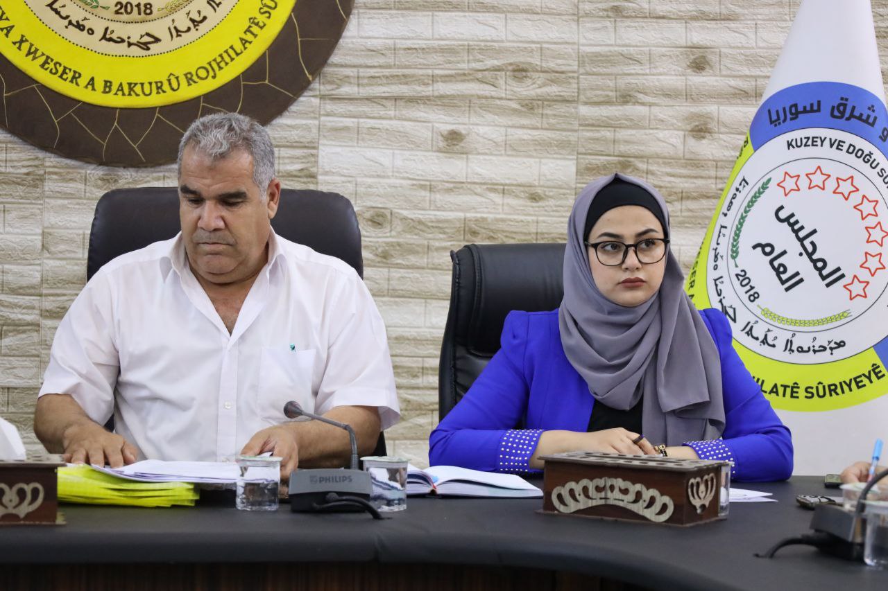 بحضور الرئاسة المشتركة للمجلس العام(سهام قريو وفريد عطي) وديوان المجلس العام وممثلين عن مجلس العدالة الإجتماعية لشمال وشرق سوريا.